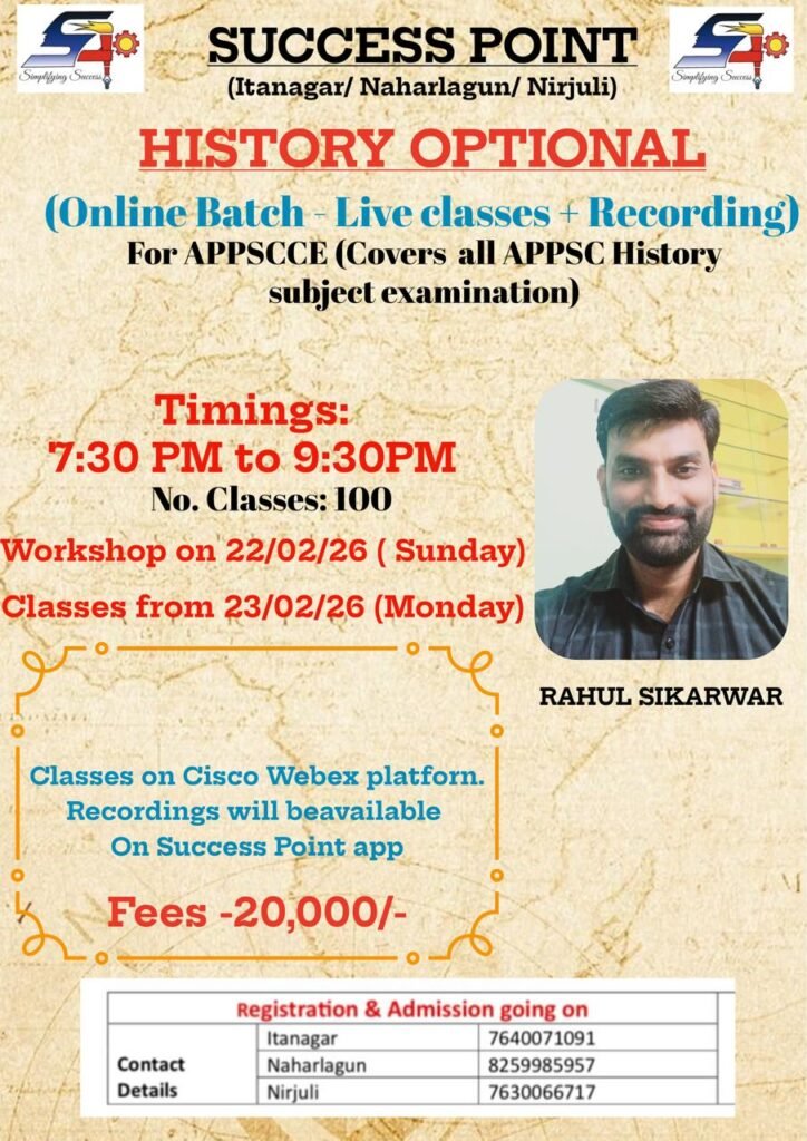 Success Point is launching its APPSCCE 2026 course modules in both online and offline modes. The programs are designed to help aspirants complete the syllabus in a structured and time-bound manner. APPSCCE Mains (only): Online module-wise courses covering GS Paper I-IV and Essay, with recorded classes. APPSCCE Prelims-cum-mains: offline module-wise courses available at Nirjuli and itanagar centers. For further details, […]